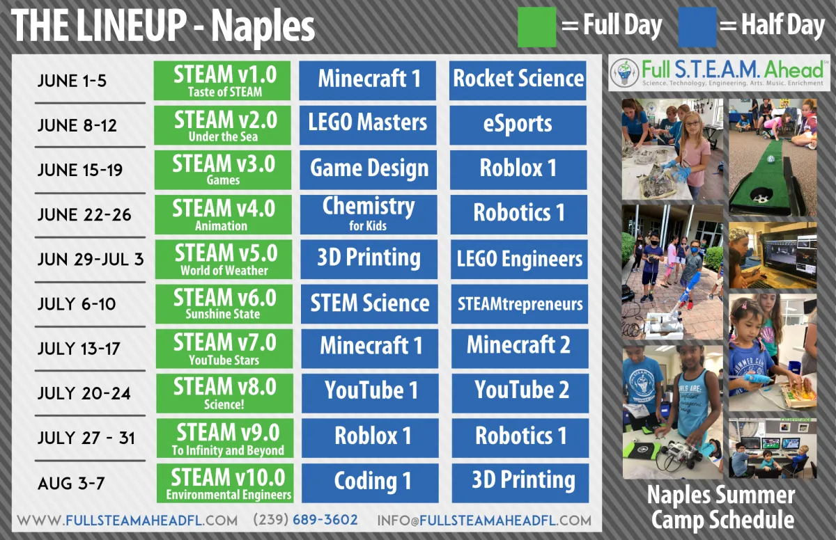 Our Full Day STEAM Camps are commonly referred to as our “best of” camps because they include a little bit of just about everything Full STEAM Ahead has to offer. As a result, each STEAM Camp has a unique theme and unique activities so that nothing is ever repeated (we’ve got over 700 unique STEAM lesson plans!!). Activities during ALL Full Day STEAM Camps include:
